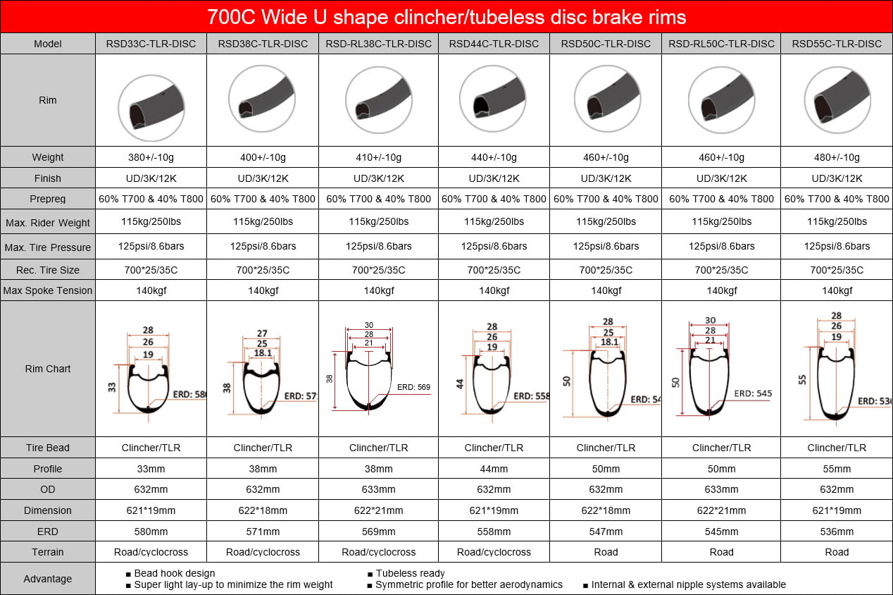 Available in 33mm, 38mm, 44mm, 50mm, 55mm, 60mm and 88mm profiles for clincher/tubeless ready.